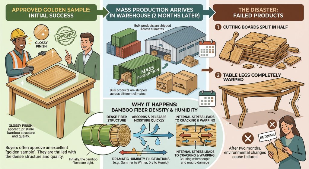 A lot of buyers receive a golden sample, approve it, and are thrilled. But two months after the mass production arrives at their warehouse, the bamboo cutting boards have split in half, or the bamboo table legs are completely warped.
